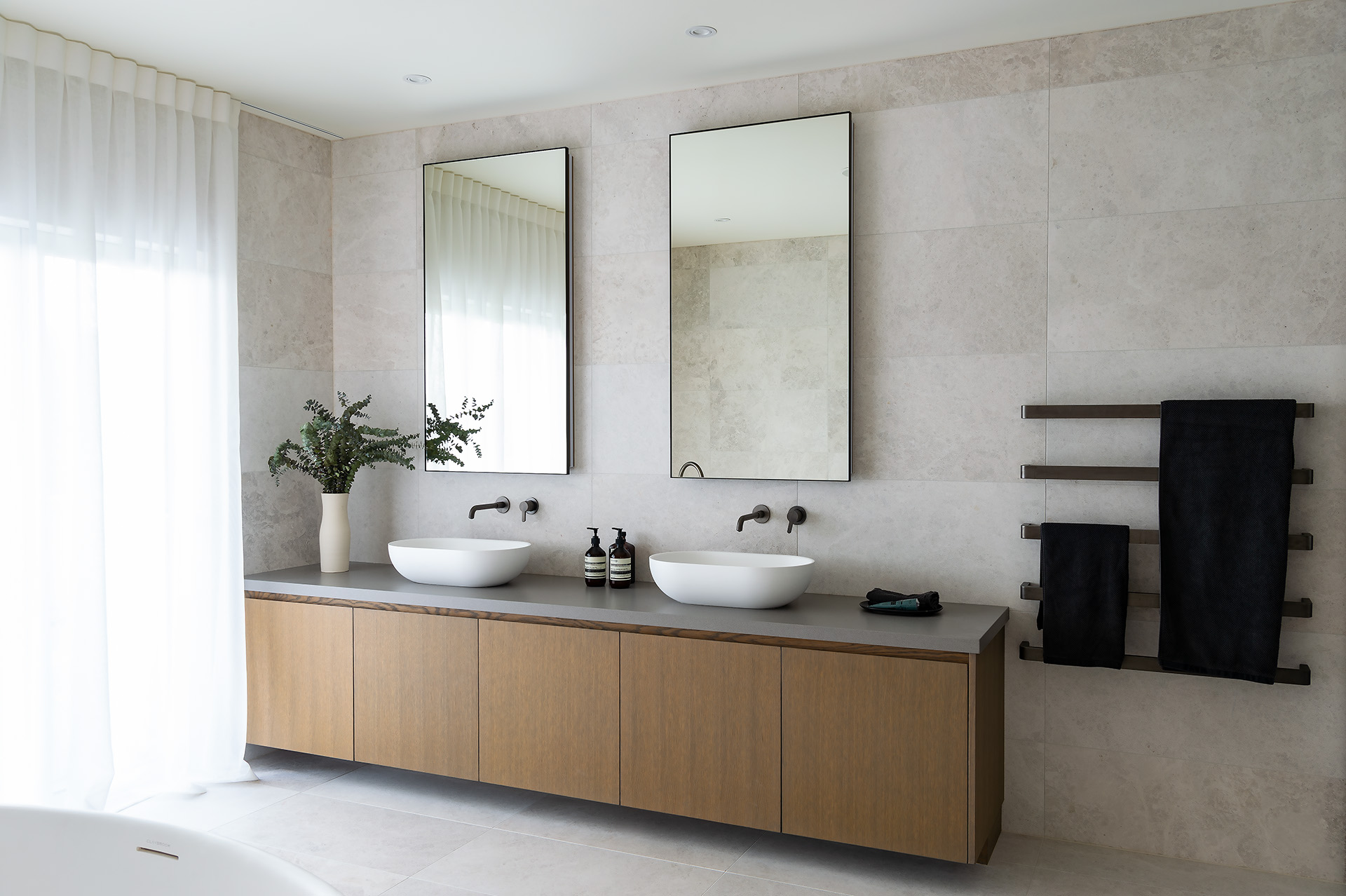 The bathrooms, flooring, and paintwork were fully updated, whilst the kitchen received new benchtops and a new feature light. Using a neutral natural stone with a sandblasted finish for the walls, paired with a veiny, darker and braver looking stone brought a beautiful balance to the room. Adding matte gunmetal-coloured tapware and detailing contrasts well. Bringing the colour of the home's hardwood floors through to the vanity completes the design echo.